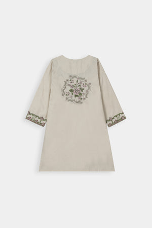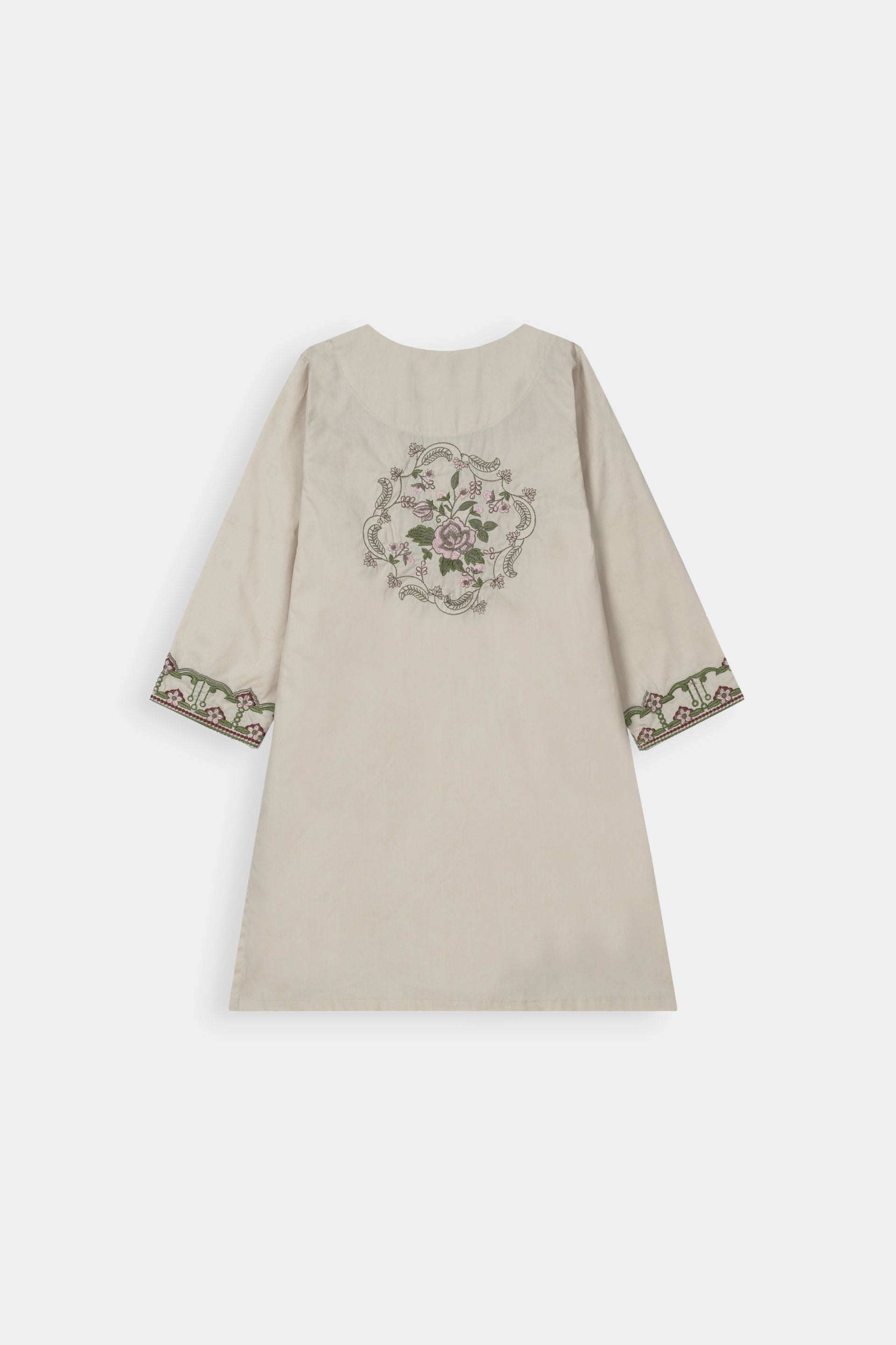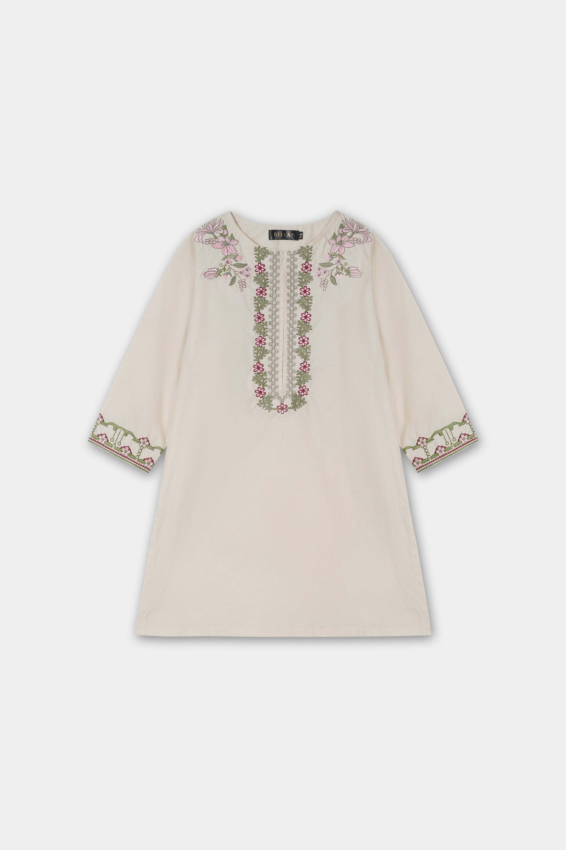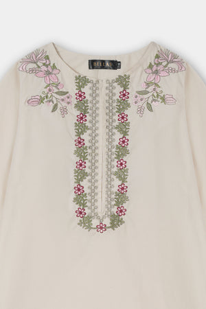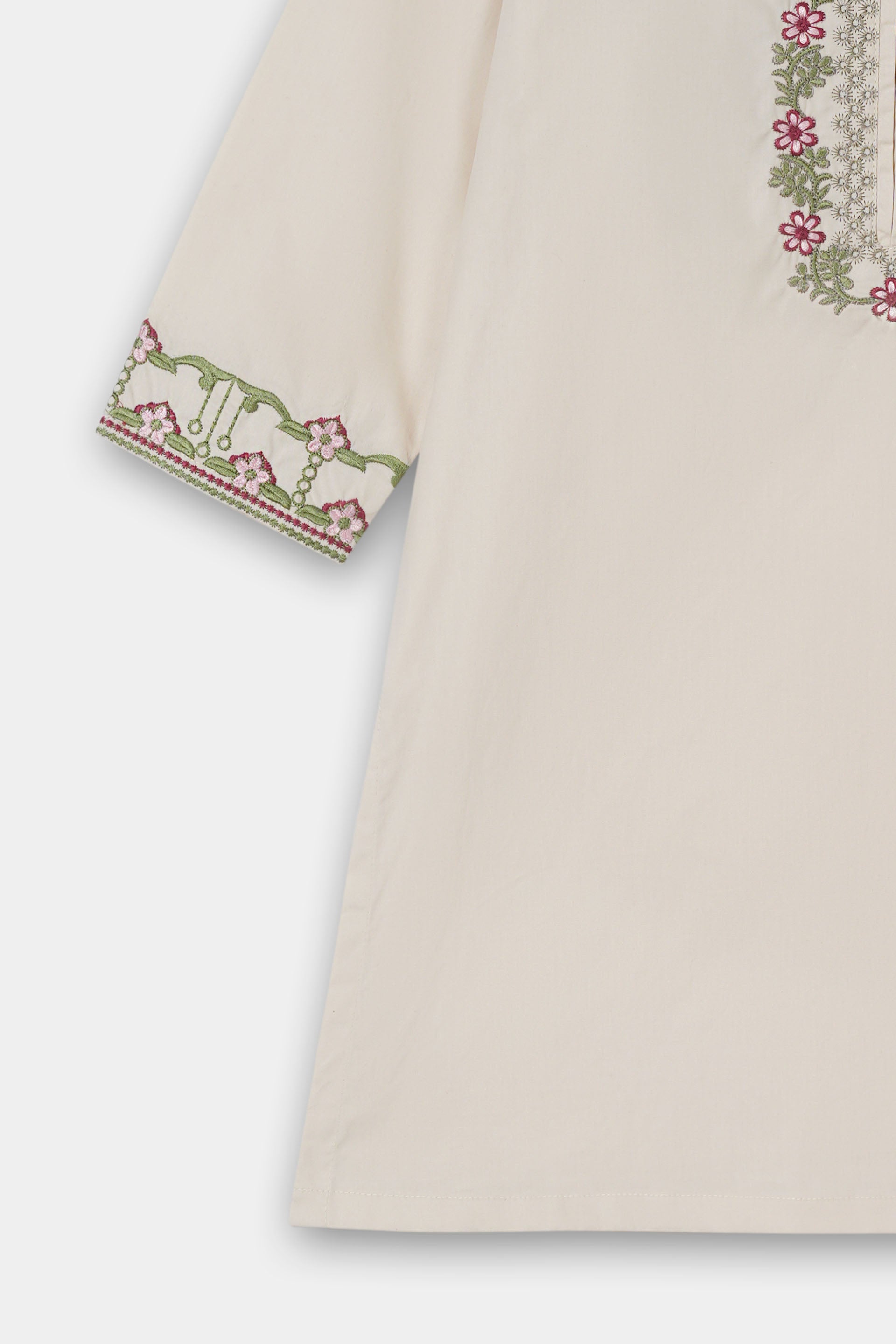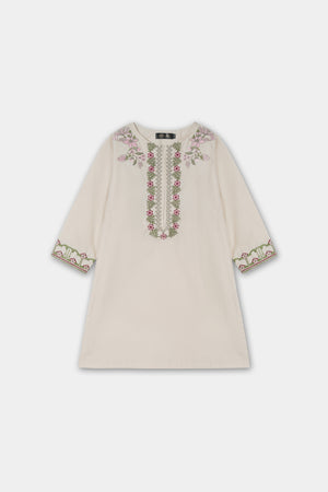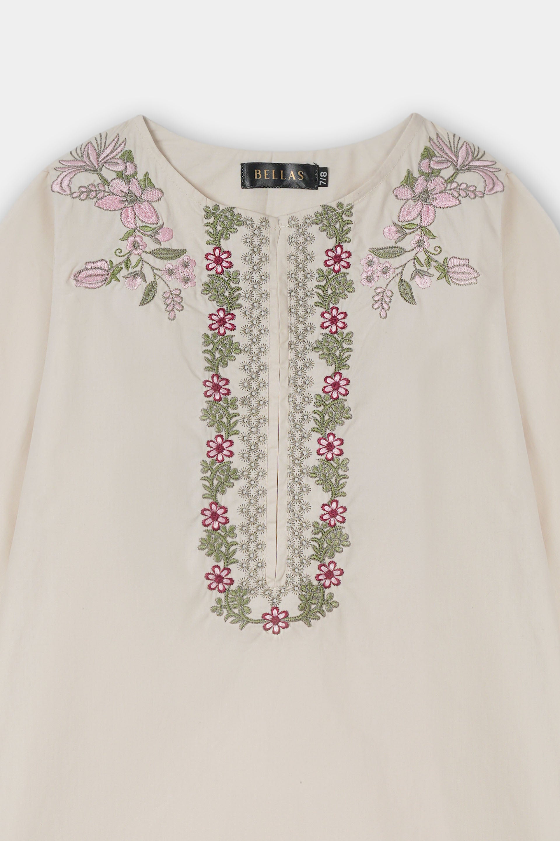 Color Harmony: The neutral Off-White/Beige base beautifully highlights the vibrant multi-color embroidery, creating a harmonious and appealing look.