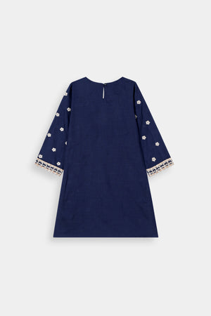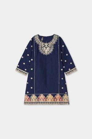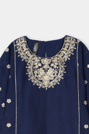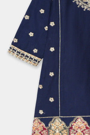 Color Palette: Deep Navy Blue base beautifully accentuated with rich gold embroidery and print, creating a royal and captivating ensemble.