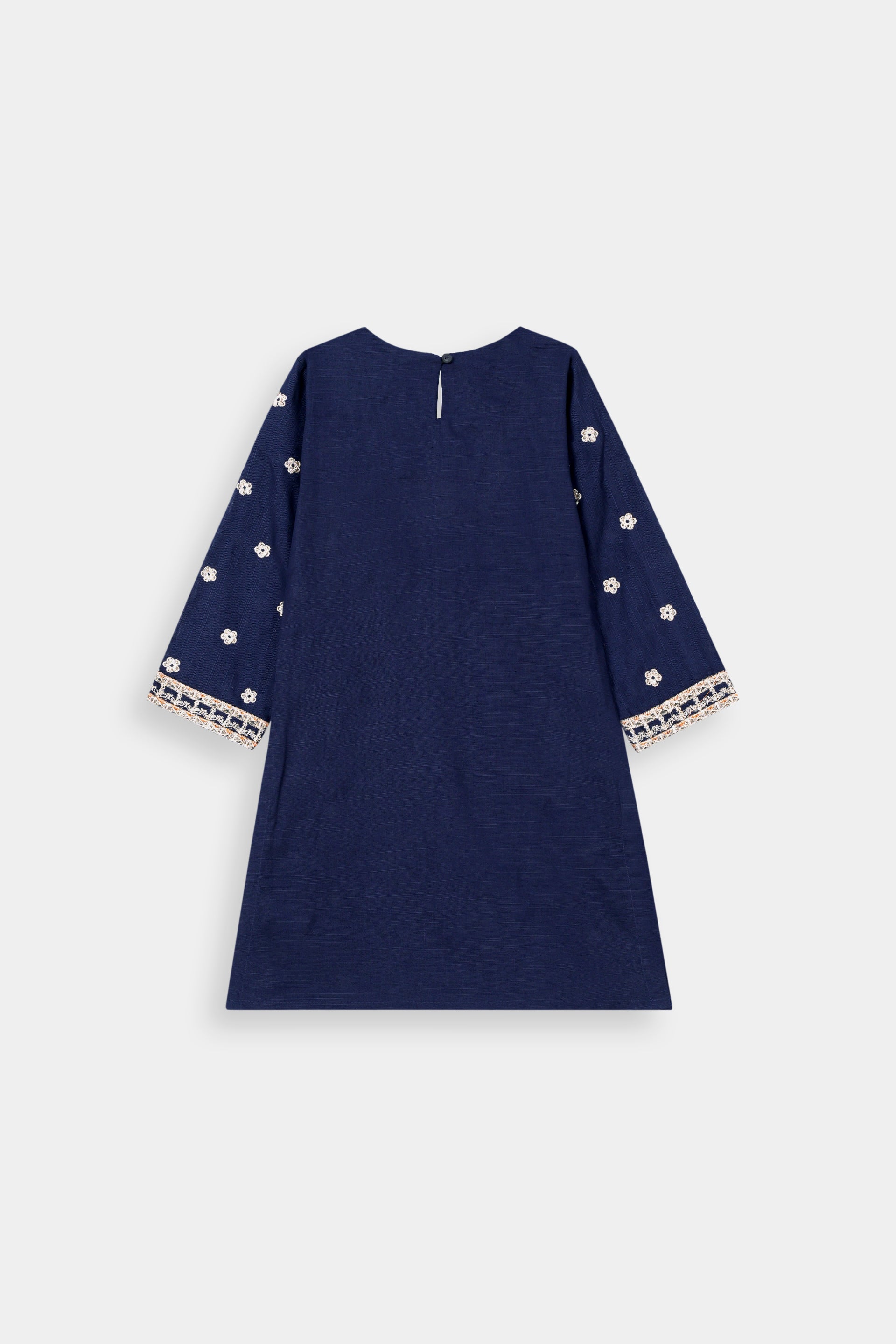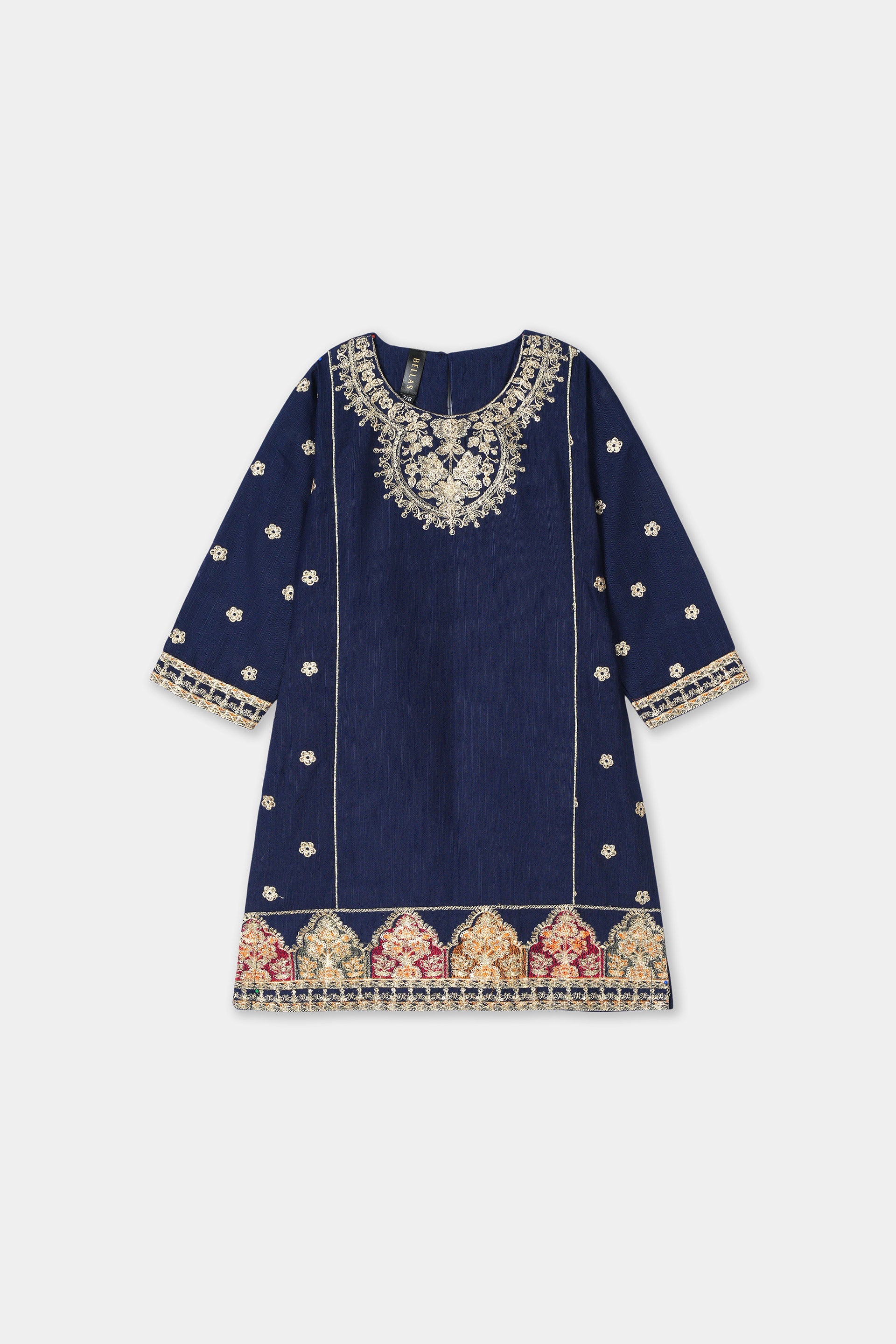 Rich Embellishments: Features intricate gold thread embroidery on the kurta's neckline and sleeves, complemented by vibrant multi-color embroidery on the lower border.