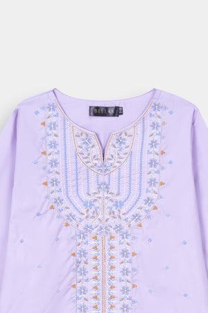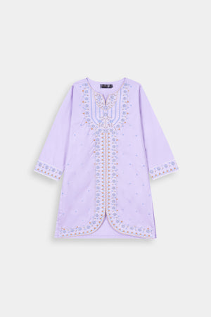 Elegant Base: A serene Pastel Lilac 2-piece suit, offering a delicate and charming appeal. The kurta features a unique curved hemline.