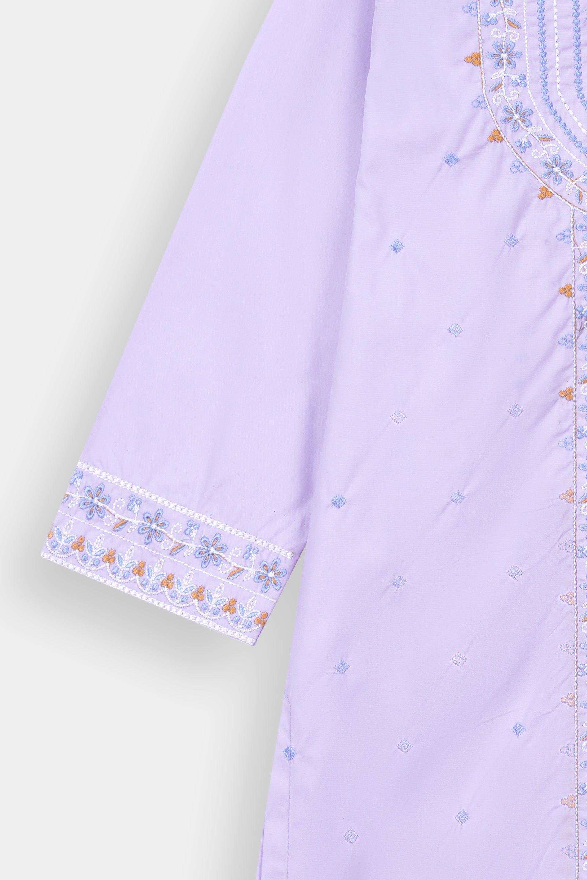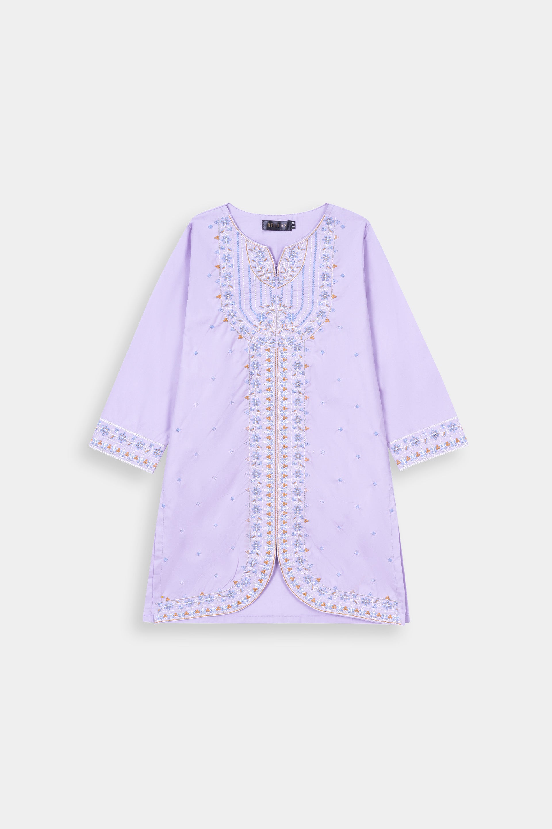Vibrant Embroidery: Features intricate multi-color thread embroidery (white, light blue, orange) on the V-neckline, central panel, and sleeves, adding a refined traditional touch.