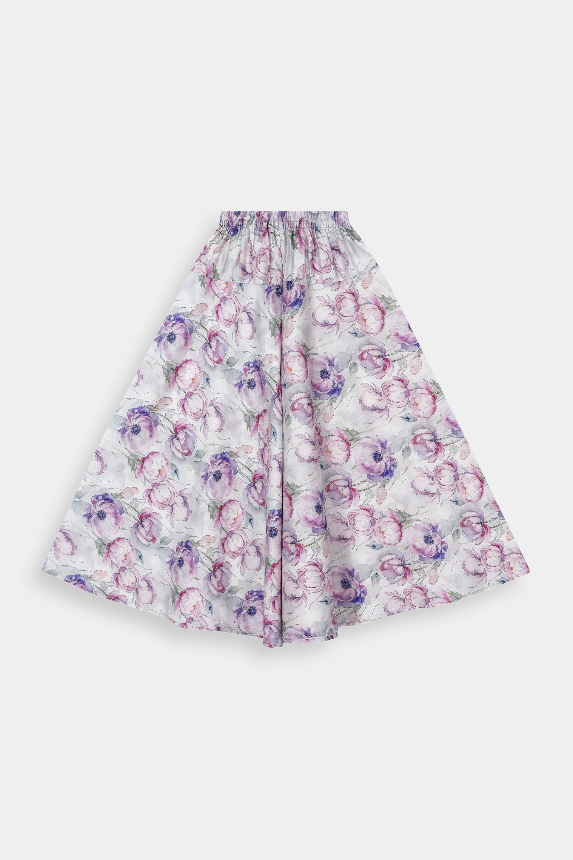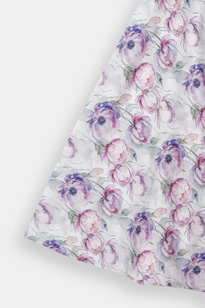 Color Harmony: The soft pastel lilac base beautifully complements the vibrant watercolor floral skirt, creating a harmonious and appealing look.