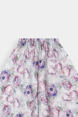 Unique Skirt: Paired with a trendy and comfortable flowy skirt adorned with a beautiful watercolor floral print in shades of purple, pink, and green on a white base, offering a modern and artistic twist to classic Eastern wear.