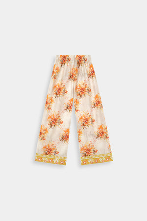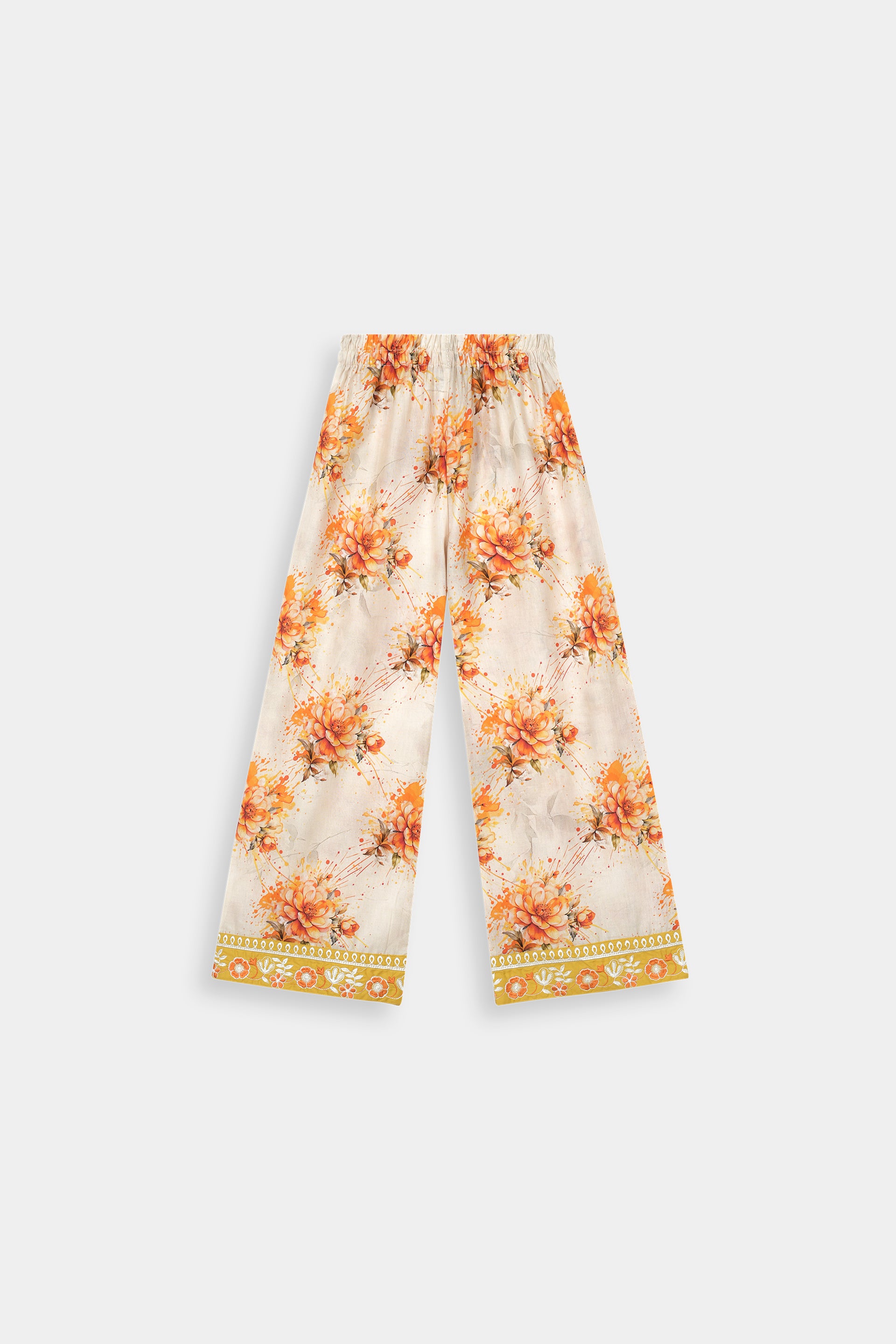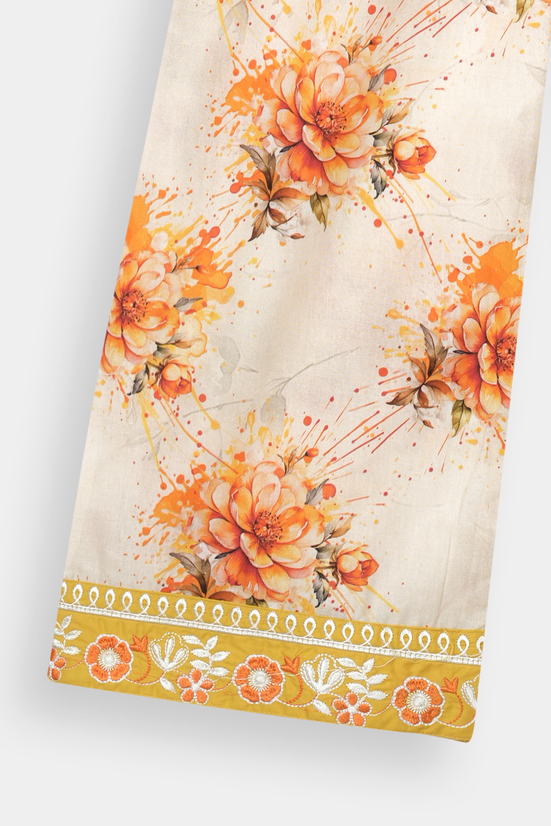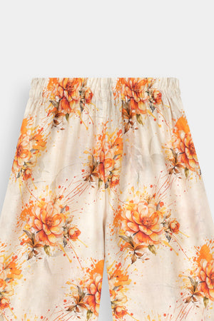 Unique Trousers: Paired with trendy and comfortable straight-cut trousers adorned with a beautiful floral print in shades of orange and white on a cream base, offering a modern twist to classic Eastern wear.