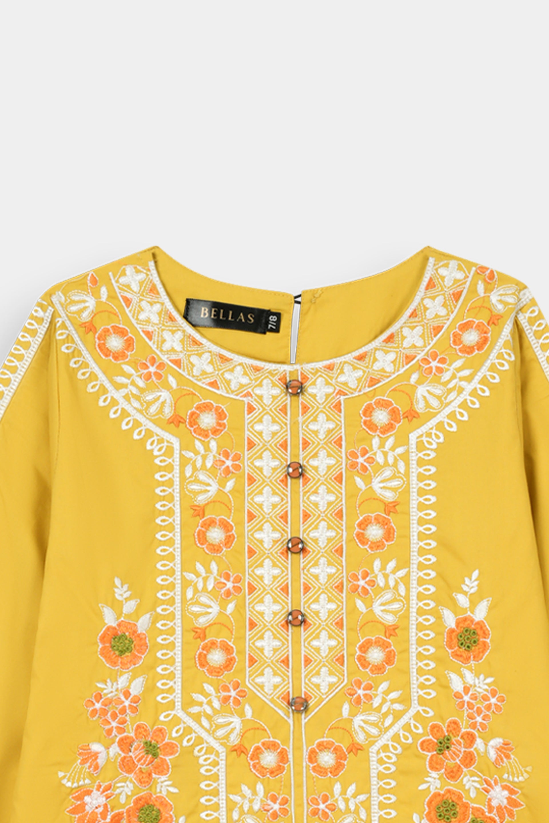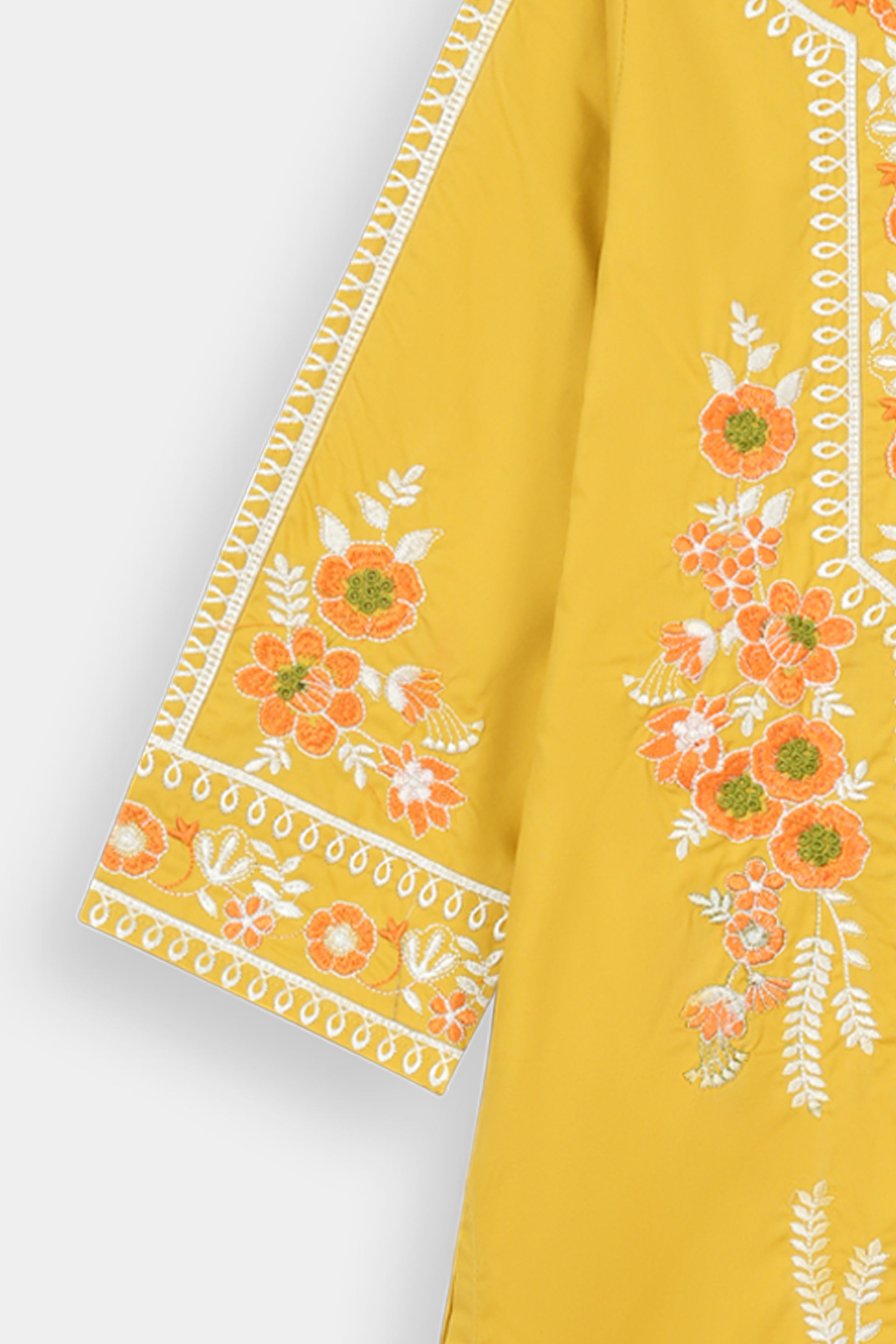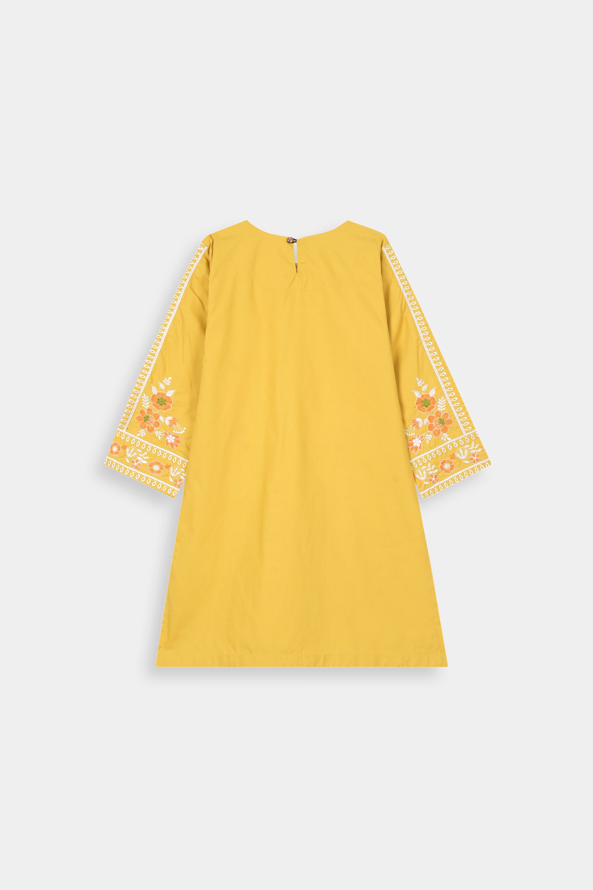 Vibrant Embroidery: Features intricate multi-color thread embroidery (white, orange, light green) on the round neckline, central panel, and sleeves, adding a lively and traditional touch.